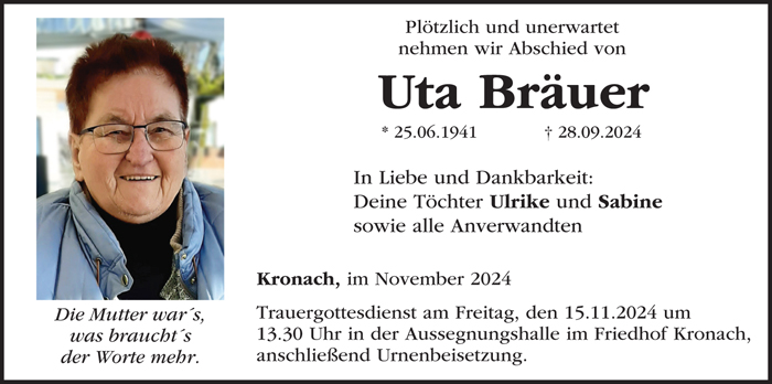 am 15.November 2024 haben wir Uta Bräuer auf dem Friedhof von Kronach auf ihrem letzten Weg begleitet.