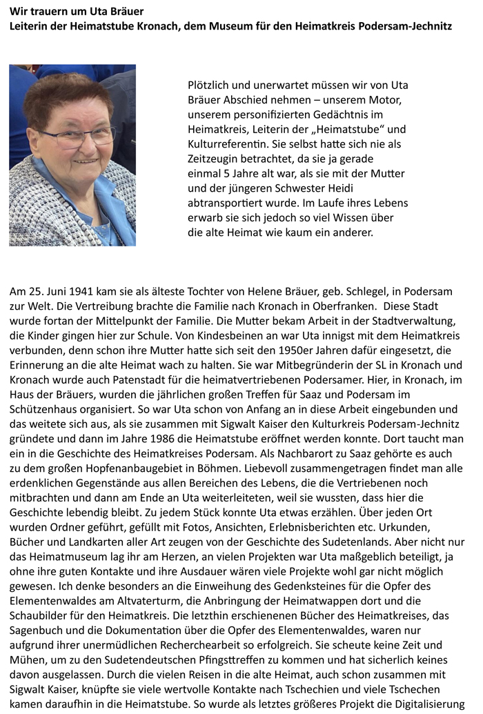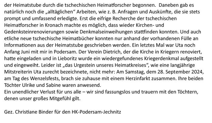 Unsere Betreuerin der Heimatstube in Kronach Uta Bräuer ist am 28. September 2024 unerwartet im