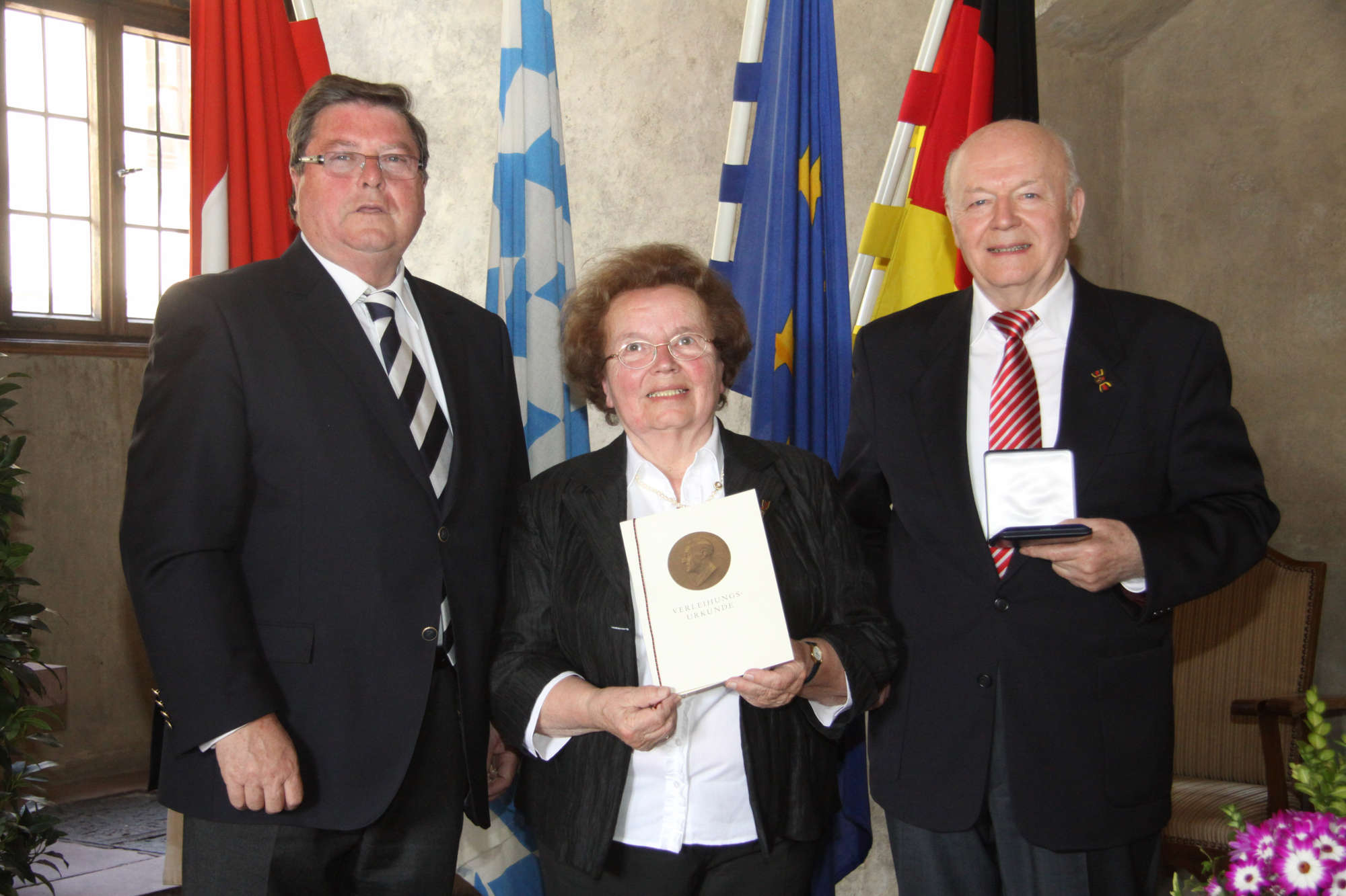 V.l.: Zweiter Bürgermeister Dr. Adolf Bauer, Heimatkreisbetreuerin Christel Demel und Alfred Sykora, der mit der Rudolf-Lodgman-Plakette geehrt wurde. Foto: Matthias Demel