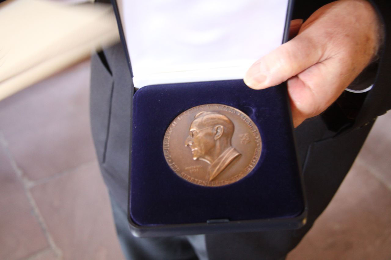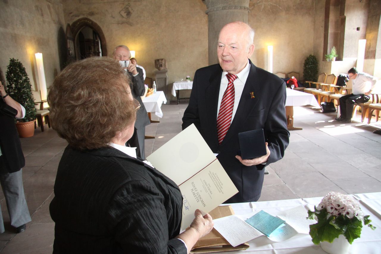 Während dieses Empfangs konnte Christel Demel, seit einem Jahr Heimatkreisbetreuerin, im Namen des Sprechers der Sudetendeutschen Landsmannschaft Bernd Posselt die sehr hohe Auszeichnung an Alfred Sykora übergeben und eine Würdigung der Persönlichkeit des Geehrten vortragen, der seit 1960 in der Sudetendeutschen Landsmannschaft ist, seit 1963 Gemeindebetreuer von Kleintschernitz und damit der dienstälteste Gemeindebetreuer unseres Heimatkreises ist. Seit 1976 gehört er dem Kreisrat an. Große Verdienste hat sich Alfred Sykora in der AG Kulturelle Sammlungen beim Sudetendeutschen Archiv München und in den Bereichen ostdeutscher, sudetendeutscher und Egerländer Familienforschung erworben, wozu auch Fahrten in die Archive Leitmeritz und Pilsen nötig waren. Darüber hinaus ist er Gründungsmitglied des Kulturvereins Podersam-Jechnitz und hat Fahne und Wappen unseres Heimatkreises mitentwickelt. Bis heute arbeitet er bei allen kulturellen Aktivitäten des Heimatkreises mit Begeisterung und Können mit, wie bei dem am gleichen Tag von Christel Demel vorgestellten neuen Sagenbuch: „Die Schätze im Rubin- und Petersberg und andere Sagen und Erzählungen aus dem Heimatkreis Podersam-Jechnitz im Sudetenland“. Alfred Sykora bedankte sich bei Dr. Adolf Bauer für die festliche Atmosphäre des Empfangs, bei der Vorsitzenden für die würdigenden und anerkennenden Worte und den Kreisräten für alle positive Zusammenarbeit.
