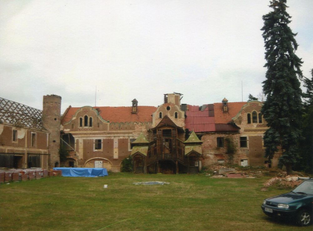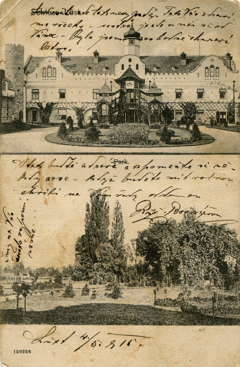 Das Schloss der Familie Baernreither in den 30er Jahren. Ganz links der Aussichtsturm. Unten: Der Park war mit exotischen Pflanzen und Bäumen angelegt.