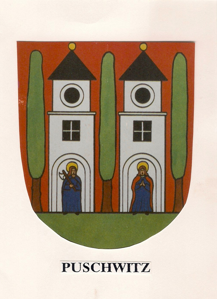 Das Stadtwappen enthält in einem roten Schilde zwei viereckige, im 2. Stock rund auslaufende silberne Türme mit schwarzen Spitzdächern, goldenen Knöpfen und Wetterfahnen; an der Basis der Türme sind Nischen in Form von Toren angebracht, in der Nische des linken Turmes steht das Standbild des Hl. Josef, in der rechten, das Standbild der Hl. Mutter Maria. Zu beiden Seiten und zwischen den Türmen stehen Pyramidal-Pappelbäume auf berastem Grunde.